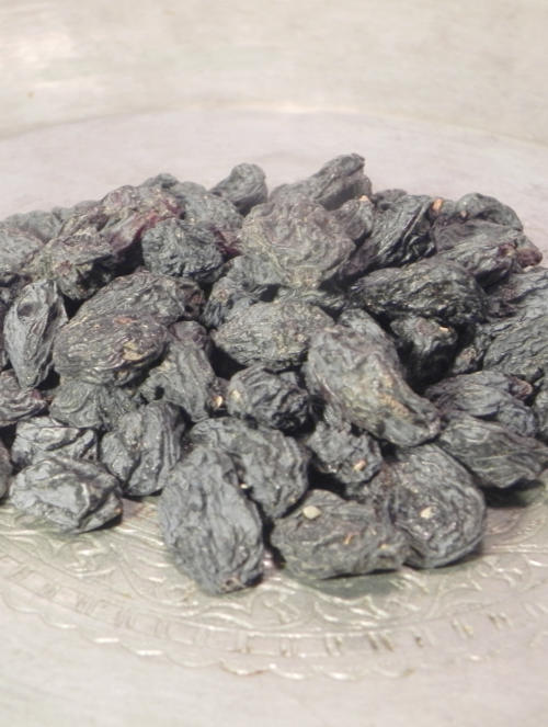 Raisin varieties depend on the type of grape used, and are made in a variety of sizes and colors including green, black, blue, purple, and yellow. Seedless varieties include the sultana (the common American type is known as Thompson Seedless in the USA), the Greek currants (black corinthian raisins, Vitis vinifera L. var. Apyrena)[2] and Flame grapes. Raisins are traditionally sun-dried, but may also be water-dipped and artificially dehydrated.
